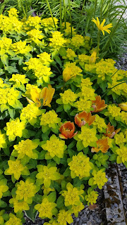 Og så er det noen som har bomma totalt på plasseringa av tulipanene Prinsess Irene. Inni denne digre vårvortemelka står det også en hosta.